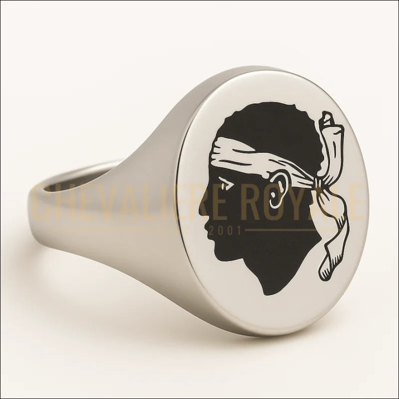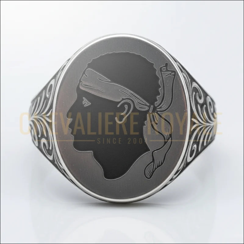 La bague corse Tête de Maure arbore un plateau ovale de 15 x 17 mm, mettant en valeur le profil emblématique de la Tête de Maure. Sa gravure nette et contrastée reflète un travail artisanal soigné. Cette chevalière corse est conçue pour durer et se transmettre.