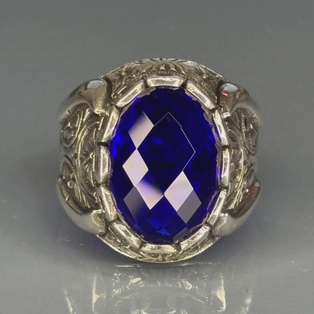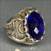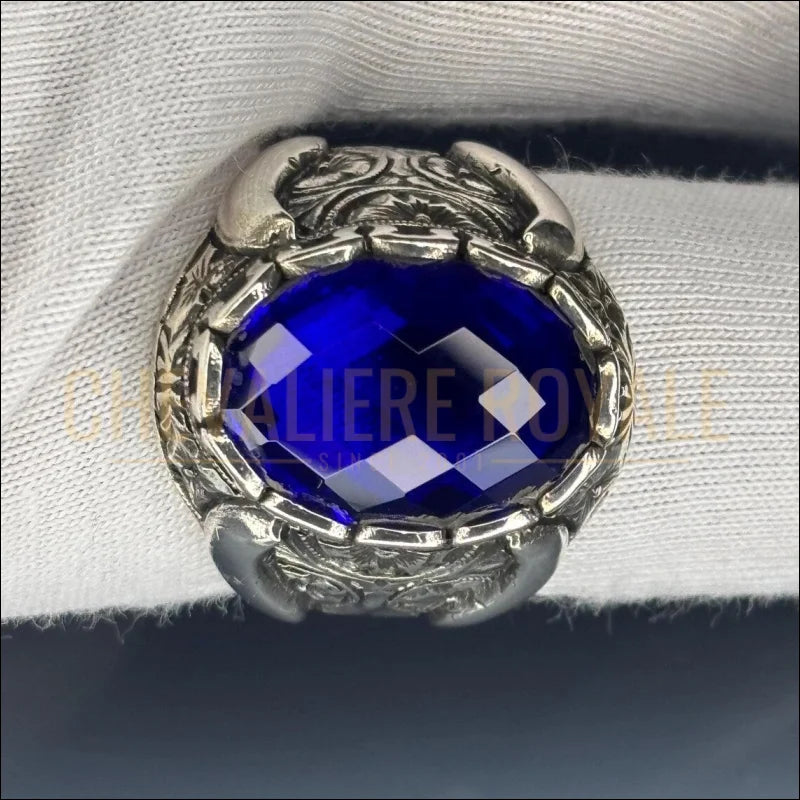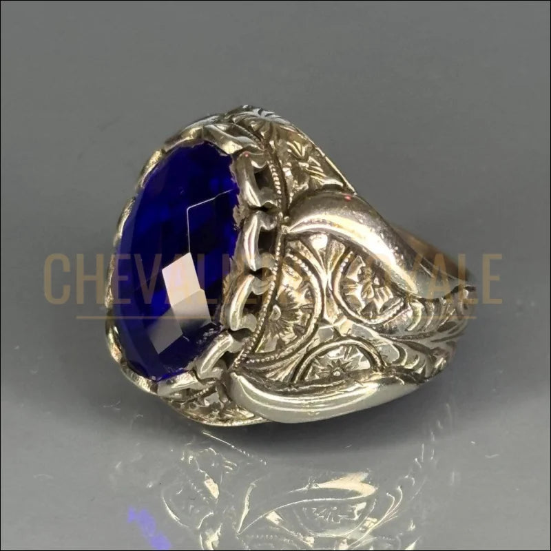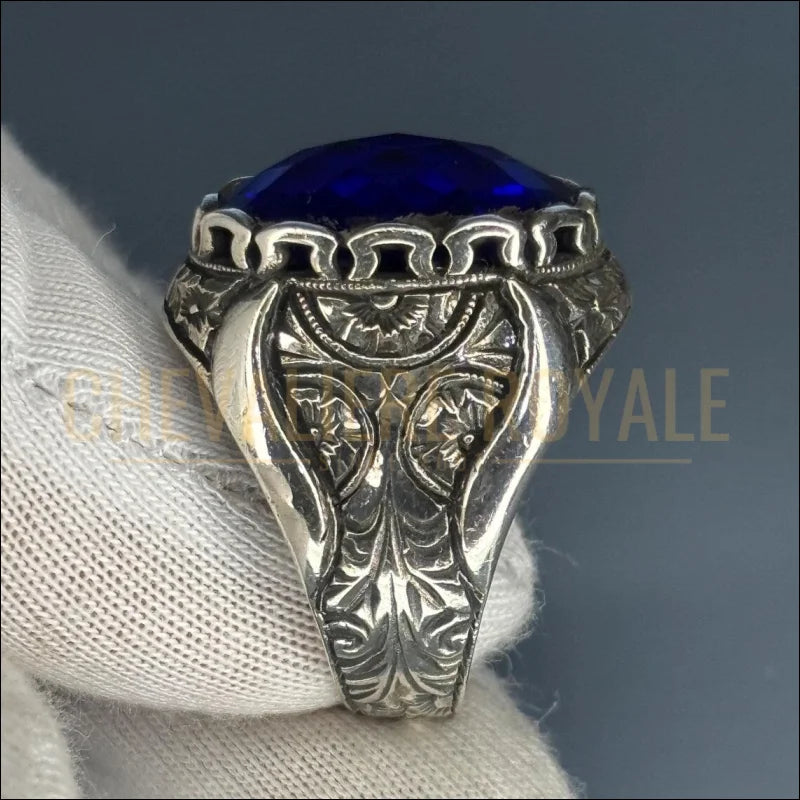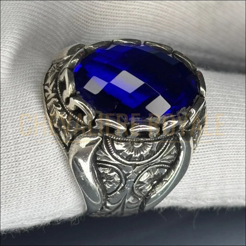 Bague-de-luxe-hommes-saphir-gravure-florale-bijoux-tendance-argent-massif-Chevaliere-Royale