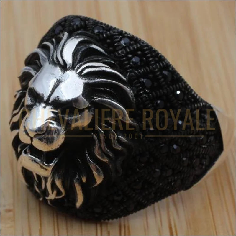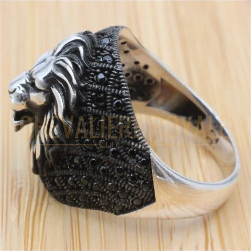 Un ajout unique à toute garde-robe. Cette magnifique chevalière tête de lion pour homme est ornée d'argent oxydé riche en détails dans une édition limitée rehaussée de micro pierres en onyx noir.