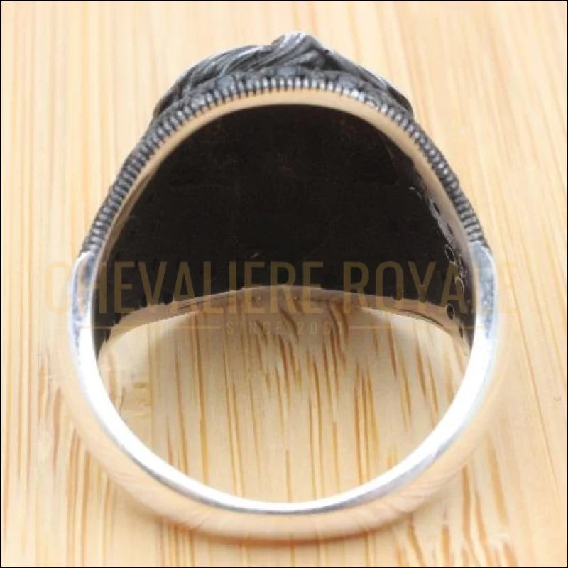 Bague Chevalière tête de lion en argent la pierre onyx noire