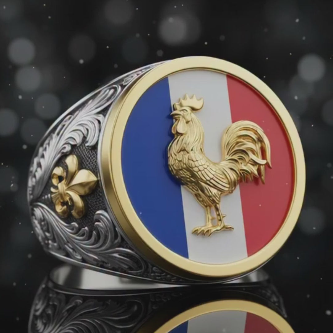 Chevalière Luxe Coq Gaulois Or 18K & Drapeau Français