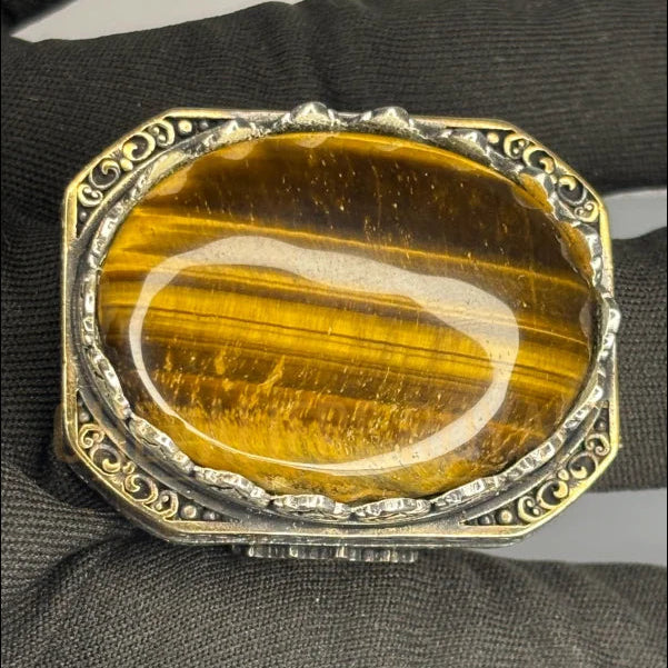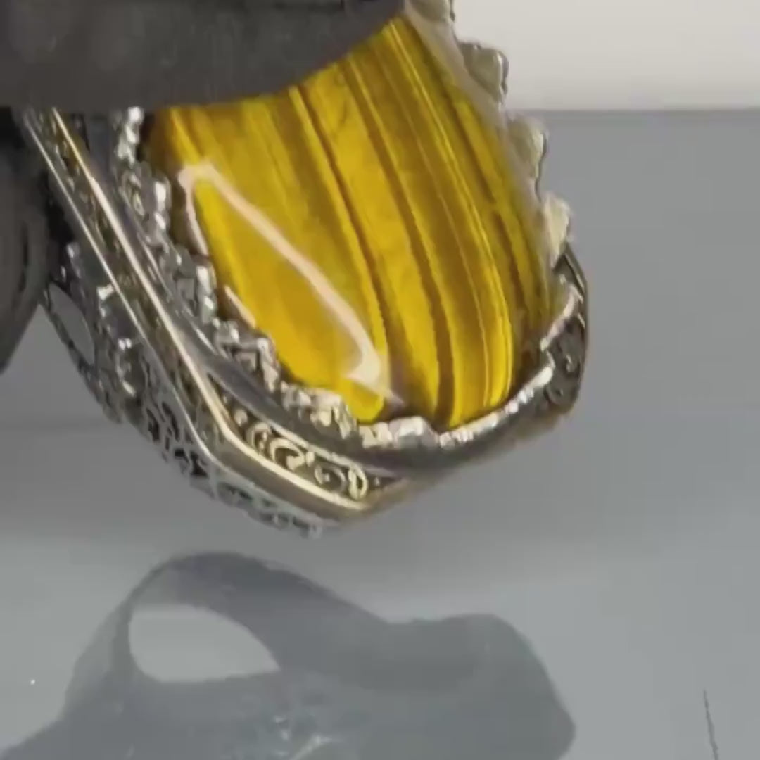 Au centre, la pierre naturelle d'Œil-de-Tigre captive le regard. Ses reflets bruns et dorés sont célèbres pour symboliser la protection, la confiance et le courage. Le sertissage complexe intègre subtilement des accents de bronze (la partie jaune) qui enrichissent la structure filigranée, offrant un contraste majestueux avec l'argent.