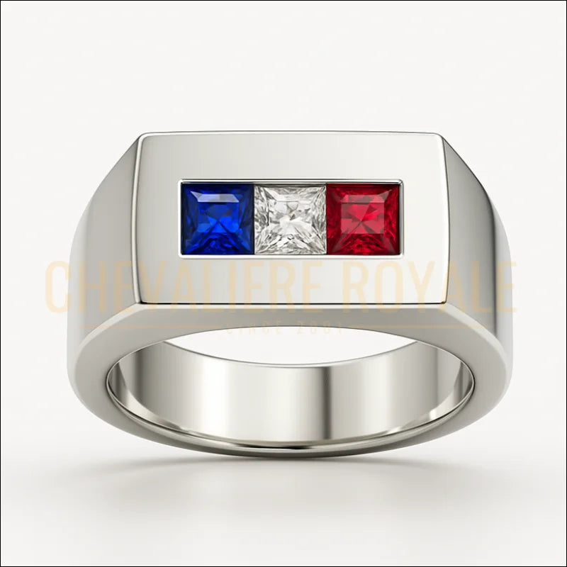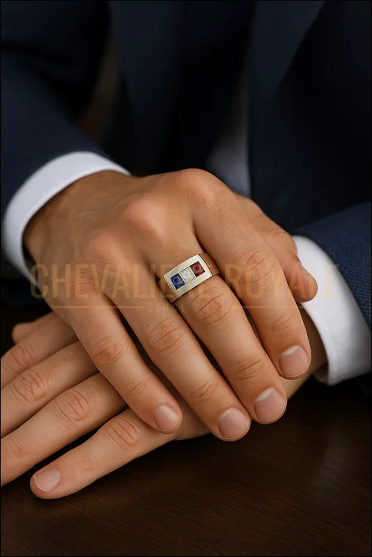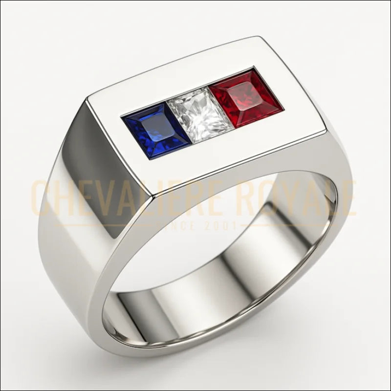 Chevalière en argent pour homme avec un design unique célébrant le patriotisme et l'élégance.