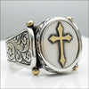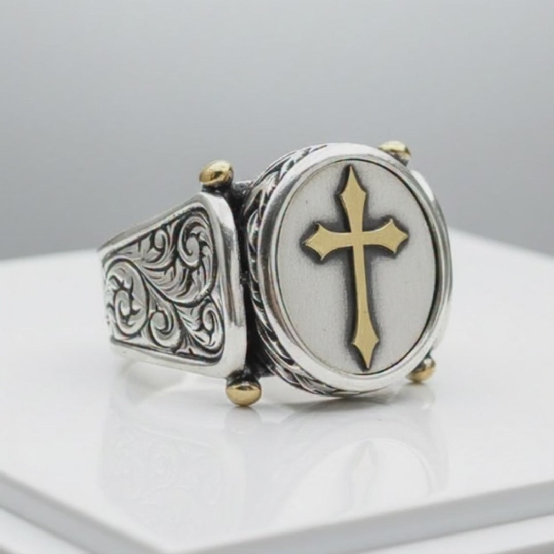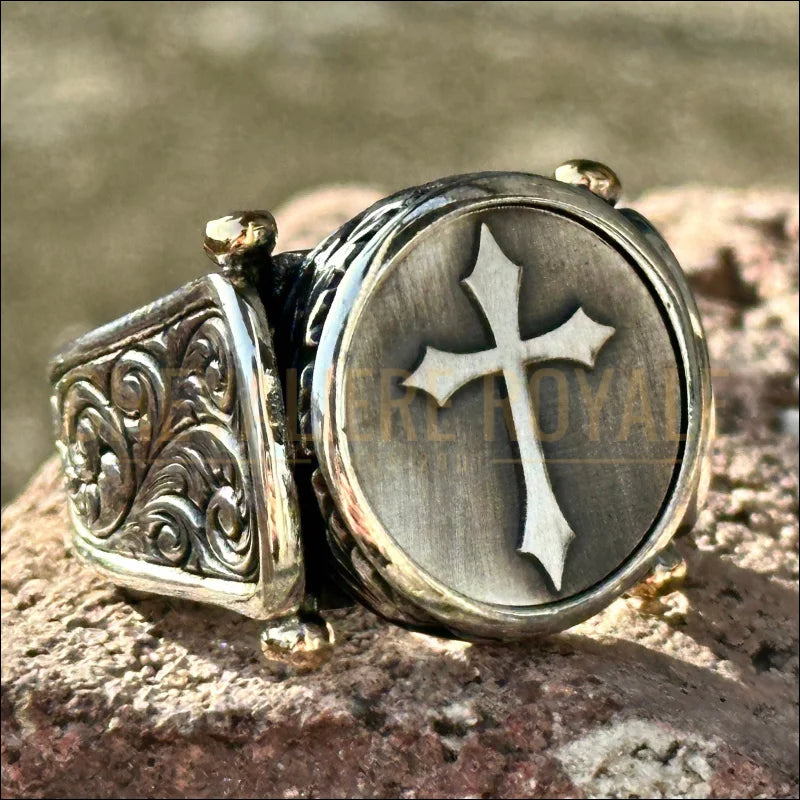 Finition Vieil argent patiné (anneau), Accents Bronze/Or (Croix)