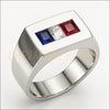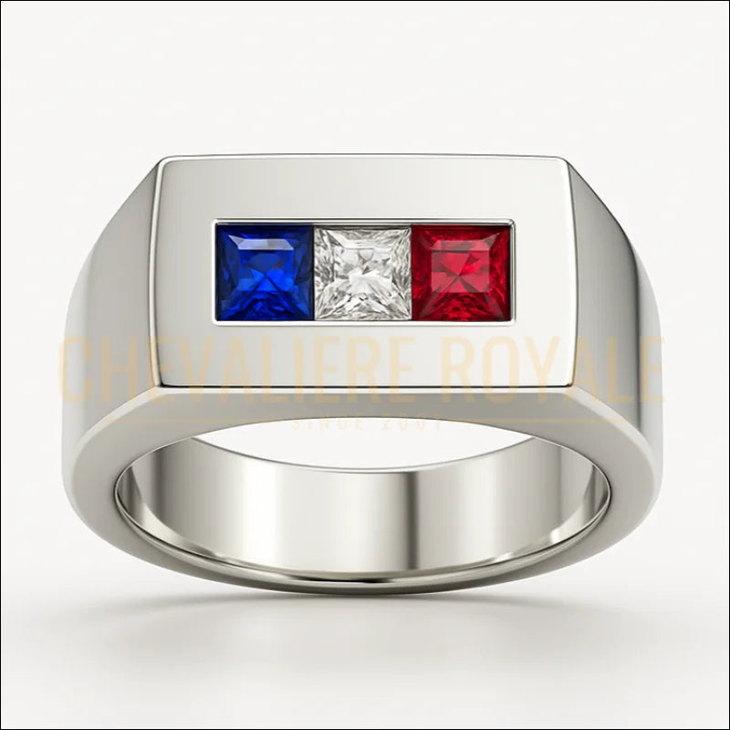 Cette chevalière drapeau tricolore met en valeur trois pierres taillées en carré :