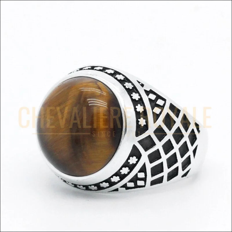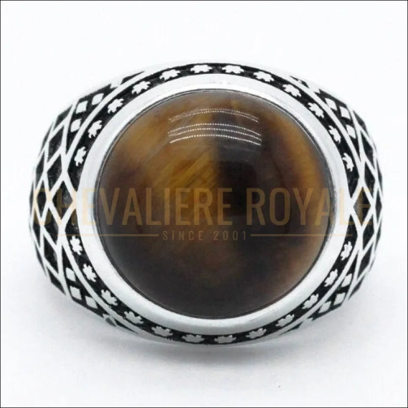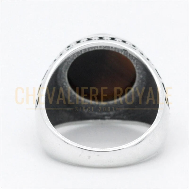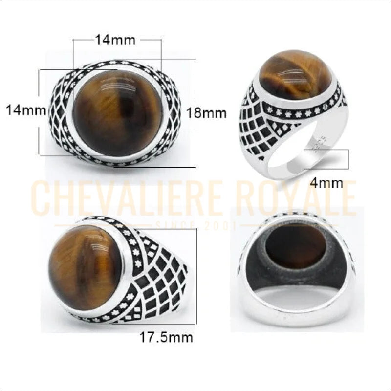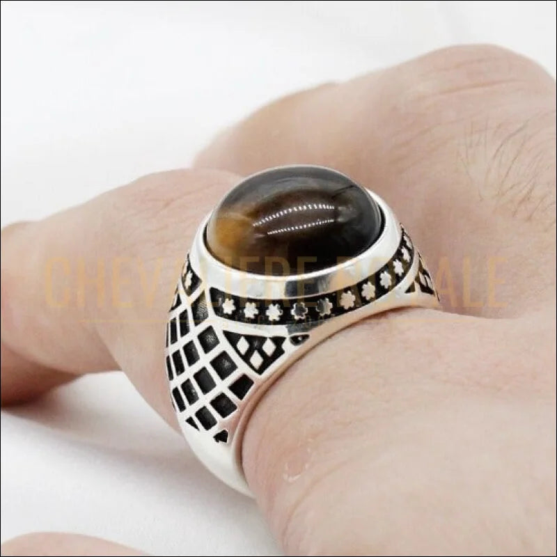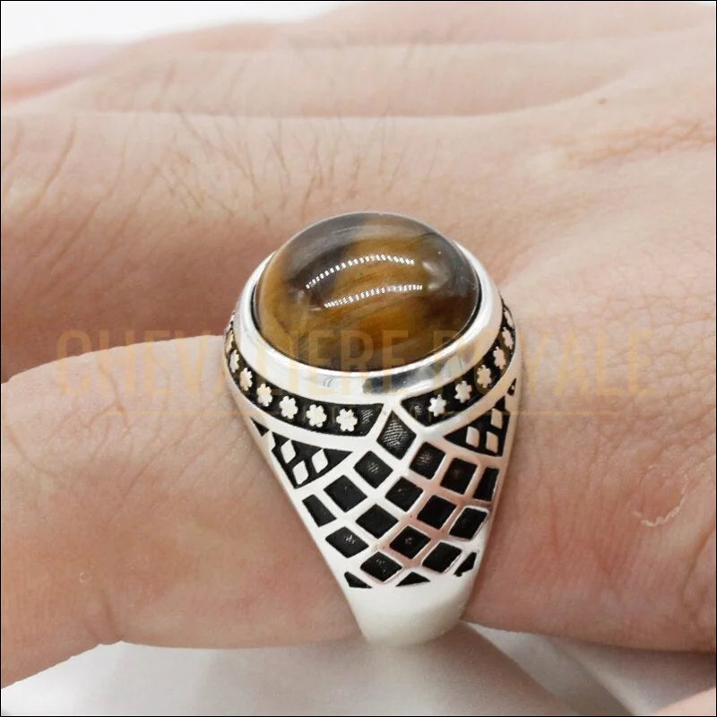 Magnifique chevalière en argent massif 9 g est un spectacle à voir avec la pierre d'œil de tigre qui est une riche nuance de brun et de noir. Le design puissant de cette chevalière reflète une allure royale.