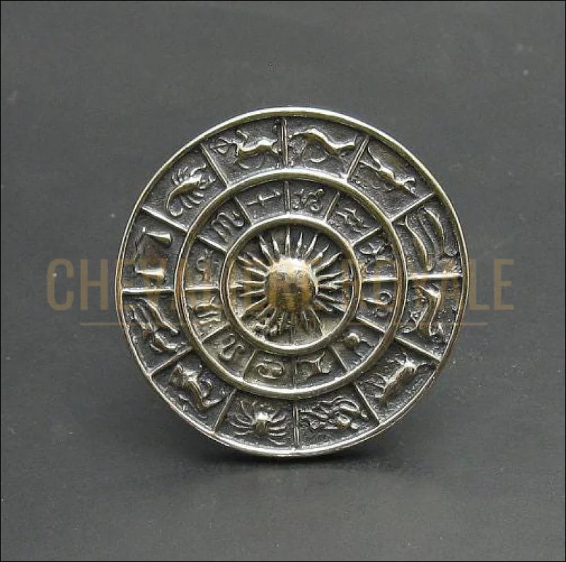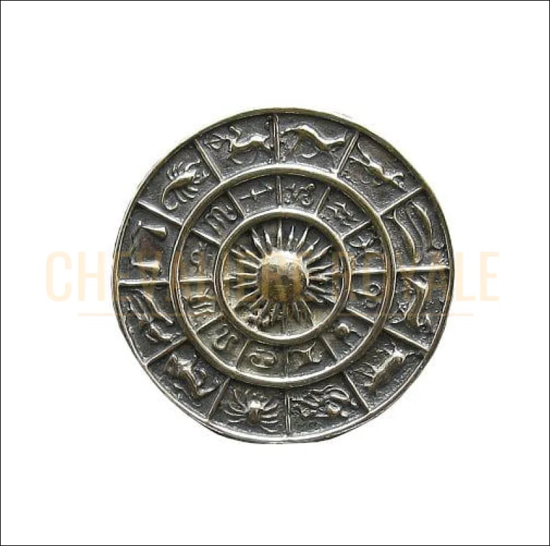 Son large plateau circulaire est orné des 12 signes astrologiques finement gravés autour d’un soleil central rayonnant, symbole de lumière, d’équilibre et de connexion à l’univers.