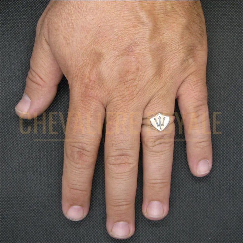 Forgée en argent sterling 925 de haute qualité, cette bague blason présente une silhouette de bouclier audacieuse, prête à orner le doigt de ceux qui apprécient l'histoire et le mystère. Au cœur de son plateau, un trident finement gravé se dresse, symbole iconique de la puissance des océans, mais aussi, dans certaines interprétations, un clin d'œil à la symbolique maçonnique de l'équilibre ternaire.