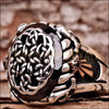 Une chevalière artisanale avec une conception originale sur mesure pour homme. Bague de gladiateur en argent plaqué rhodium, design nœud, gravée en pierre d'ambre avec motifs de chaînes, entièrement faite à la main.