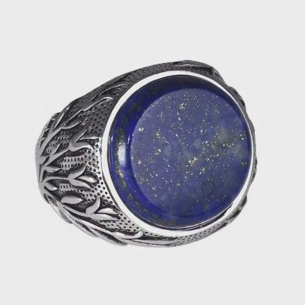 Le plateau accueille un cabochon rond de lapis-lazuli, une pierre bleue intense parsemée d'éclats dorés de pyrite, rappelant un ciel étoilé. Bien plus qu'une simple chevalière, ce bijou est une pièce d'artisanat robuste pensée pour l'homme moderne qui apprécie les accessoires avec une histoire et une âme.