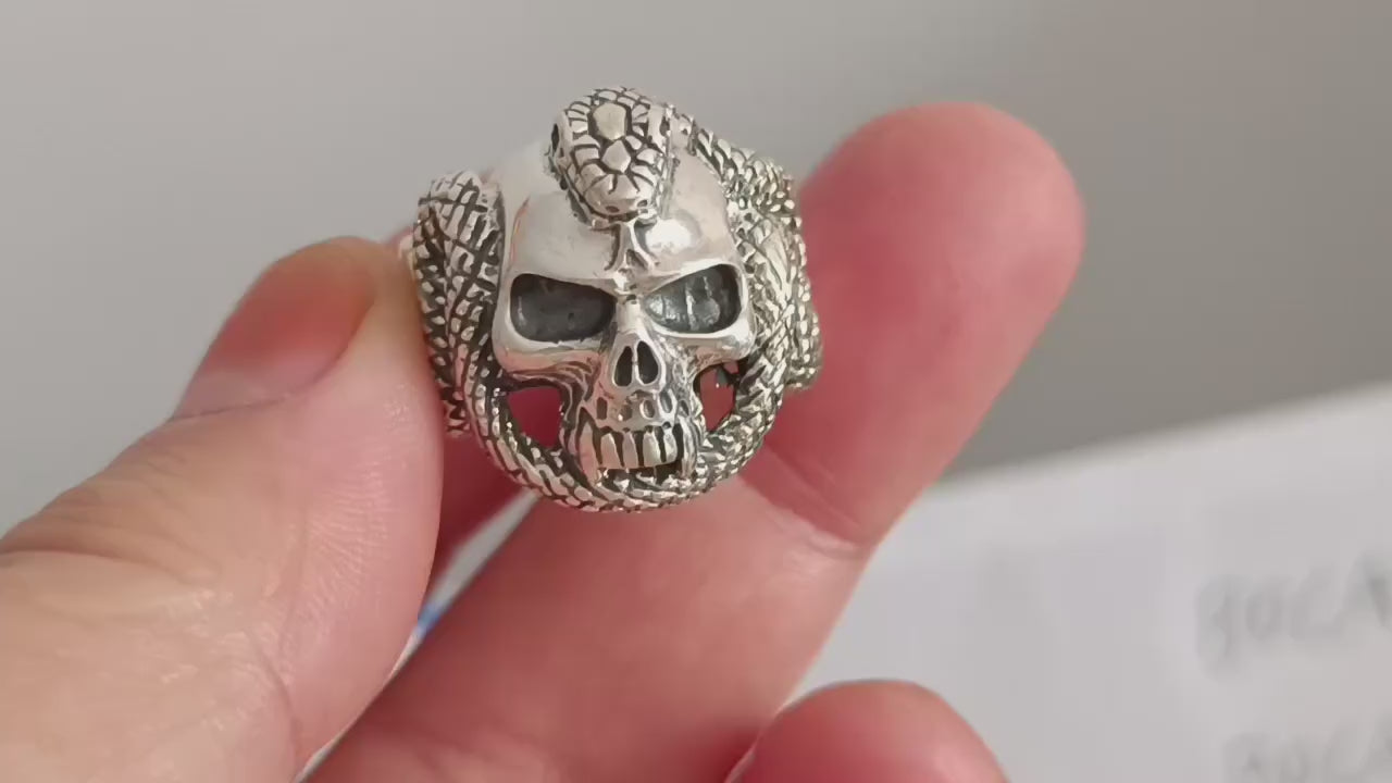 Chevalière homme en argent tète de mort et serpent style gothique Voir les options