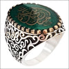 Chevalière homme au style islamique en argent, cette conception spéciale met en avant l'art de la calligraphie arabe gravé à l'intérieur, avec une subtile touche de couleur verte, adoptant une forme ovale élégante.