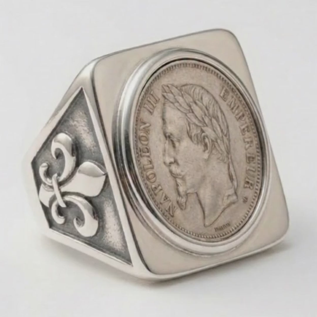 Pièce d'exception conçue pour les passionnés d'histoire et les amateurs de bijoux massifs et authentiques. Ornée du puissant motif de la Fleur de Lys sur les côtés, cette chevalière n'est pas un simple anneau : c'est un fragment tangible du Second Empire, portant en son cœur une véritable monnaie historique.