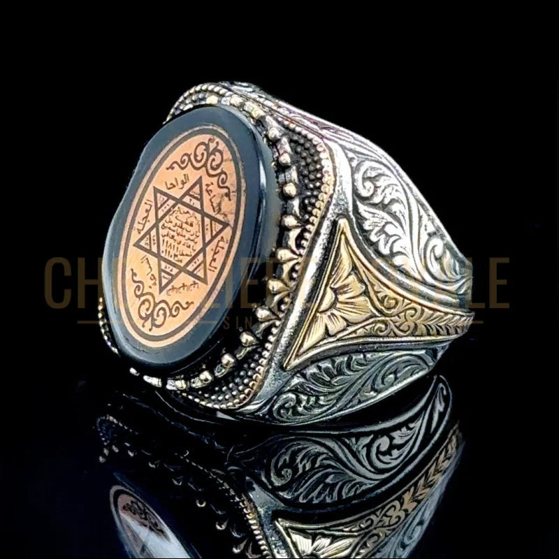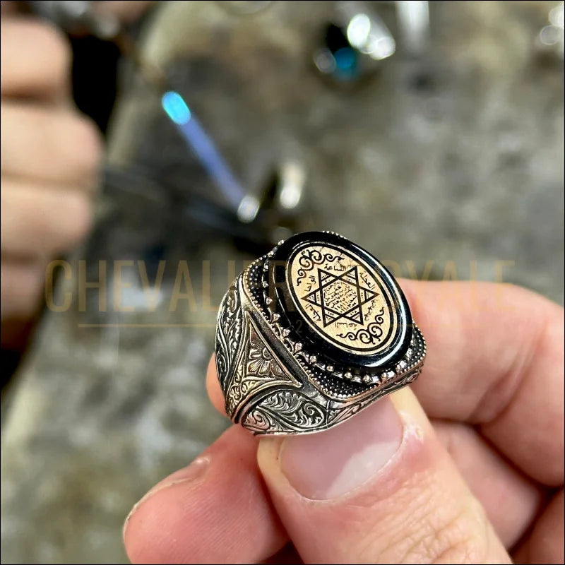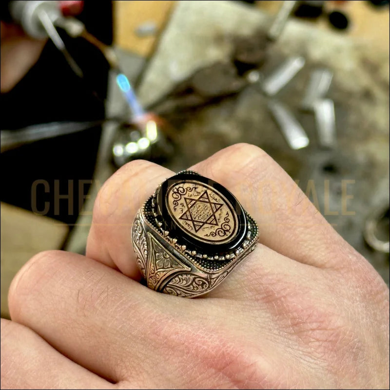 Tenez entre vos mains non pas une simple bague, mais un fragment d'histoire et de légende. Cette chevalière est directement inspirée des secrets de Salomon, Roi et Grand Sage dont le nom est synonyme de puissance et de protection divine.