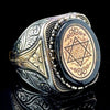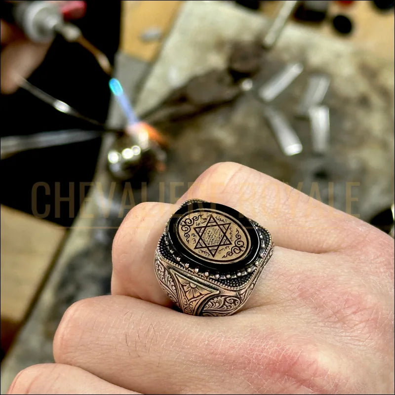• L'Étoile de David (Sceau de Salomon) : Ce puissant symbole géométrique (l'hexagramme) est le cœur de la bague. Il représente l'union du ciel et de la terre, et est historiquement reconnu comme un talisman de protection contre les forces du mal.