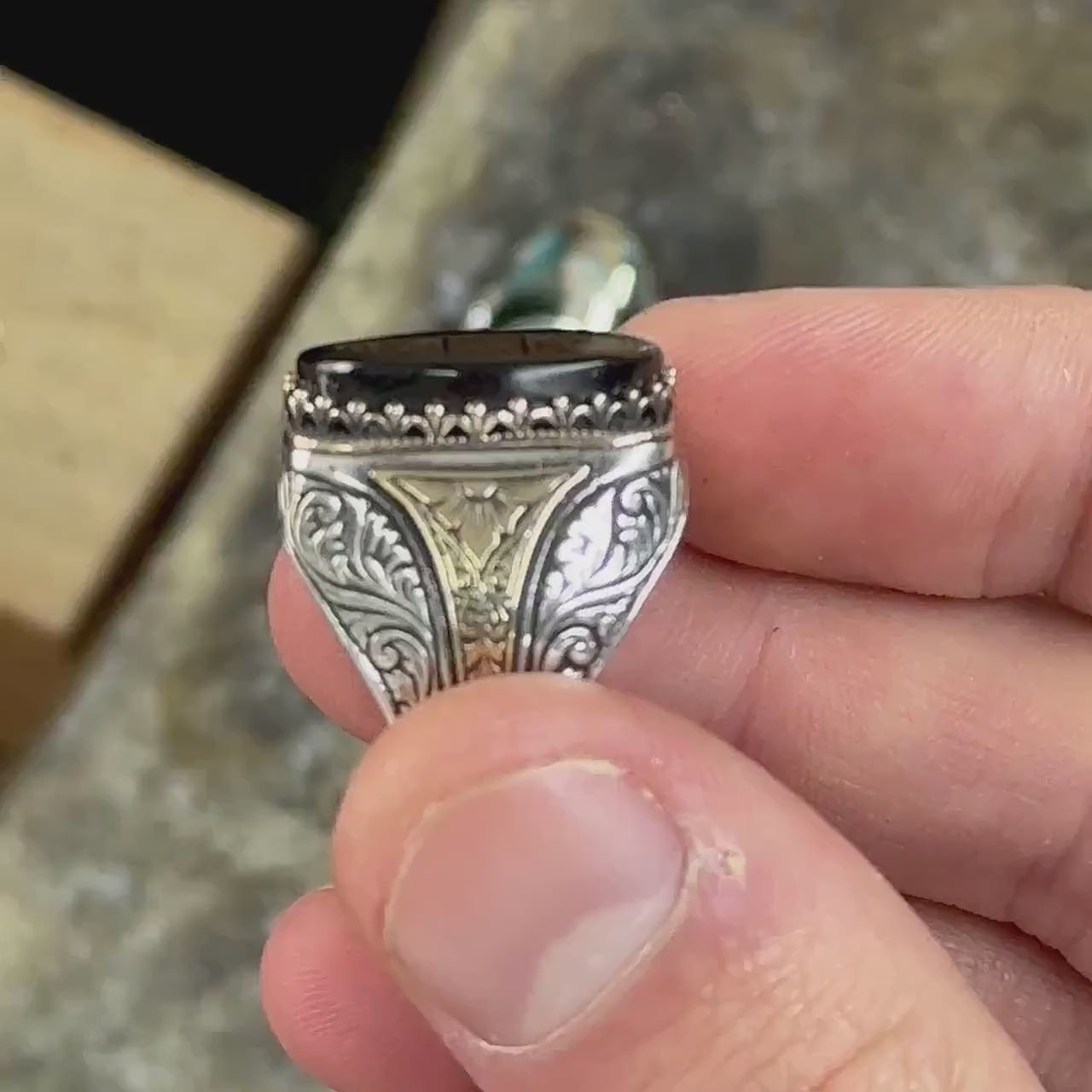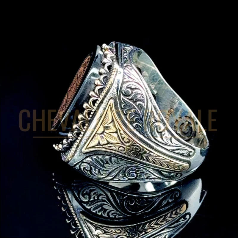 La bague elle-même est une prouesse d'artisanat. L'anneau en Argent Sterling 925 massif est richement sculpté de motifs floraux (volutes) et tribaux, tandis que les accents de Bronze (couleur or) mettent en lumière la structure complexe du sceau.