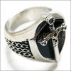 Cette chevalière homme, en forme de boucle, évoque la tradition et la bravoure des chevaliers d'antan. Au cœur de cette bague unique, une épée de chevalière repose fièrement sur un plateau noir, symbolisant la force et le courage.